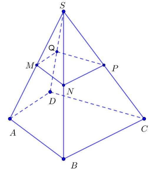 Dễ thấy phép vị tự tâm S tỉ số 2 biến khối chóp S.MNPQ thành khối chóp S.ABCD.