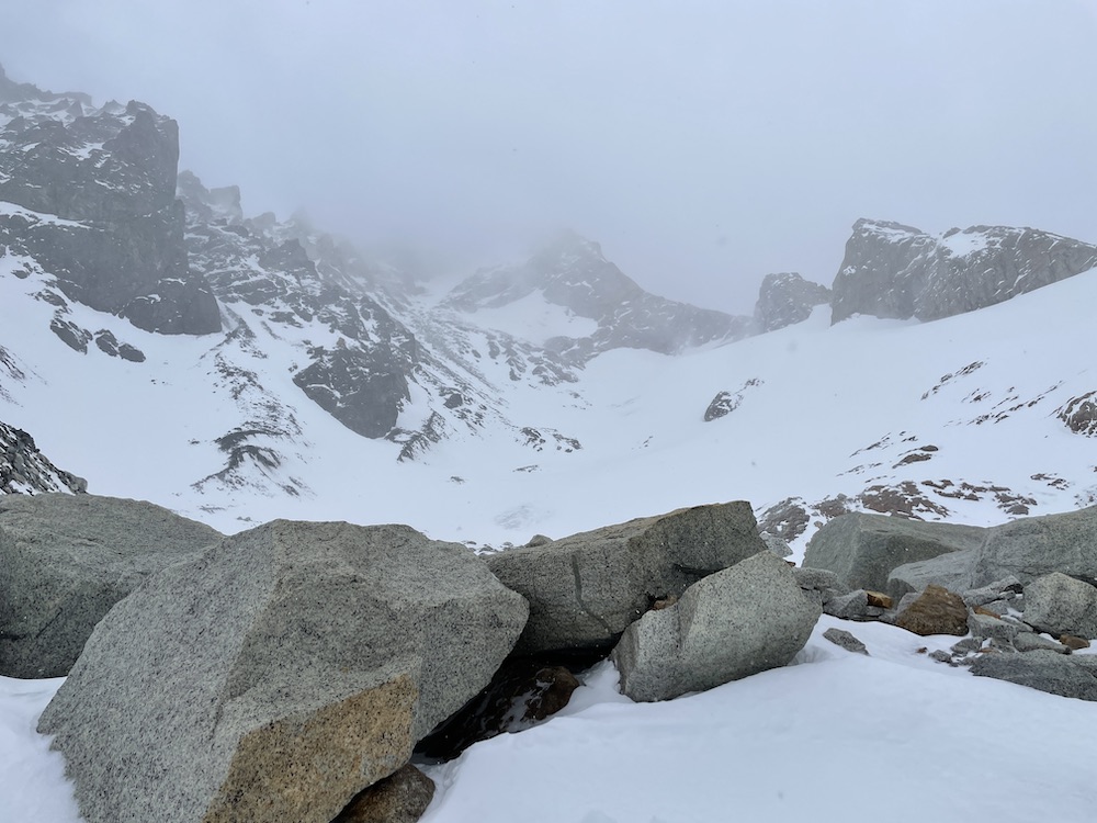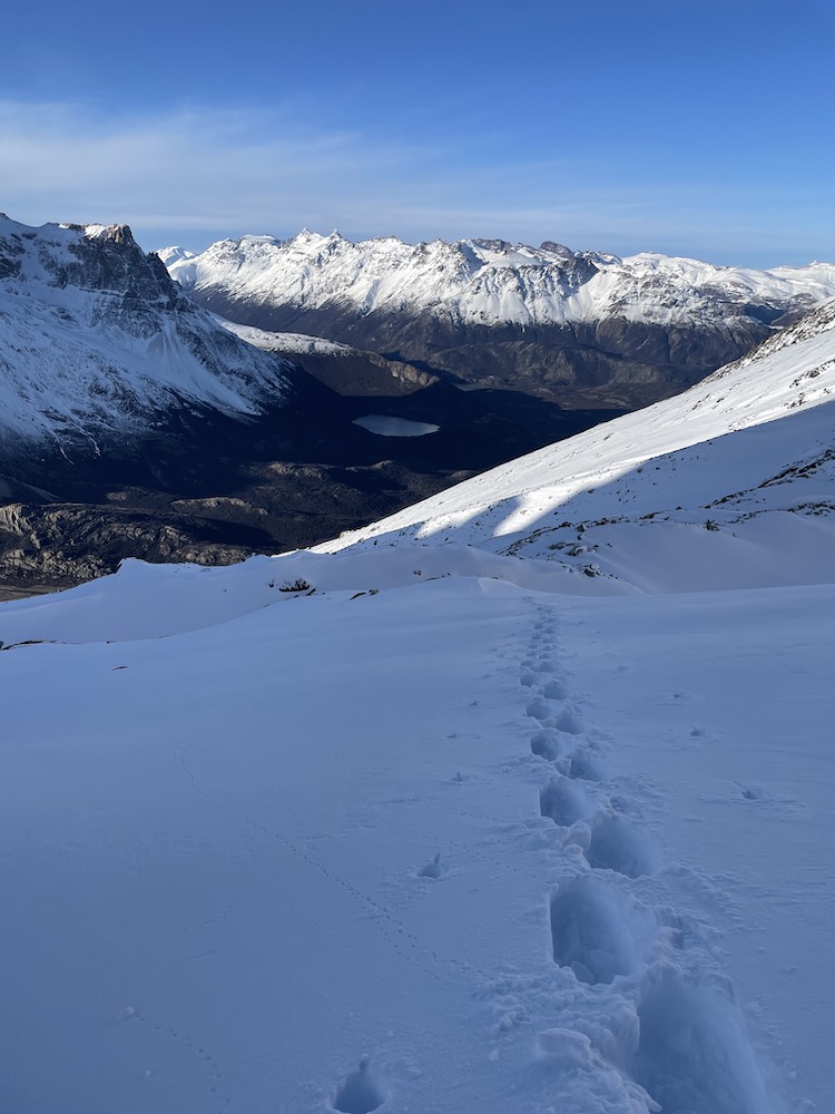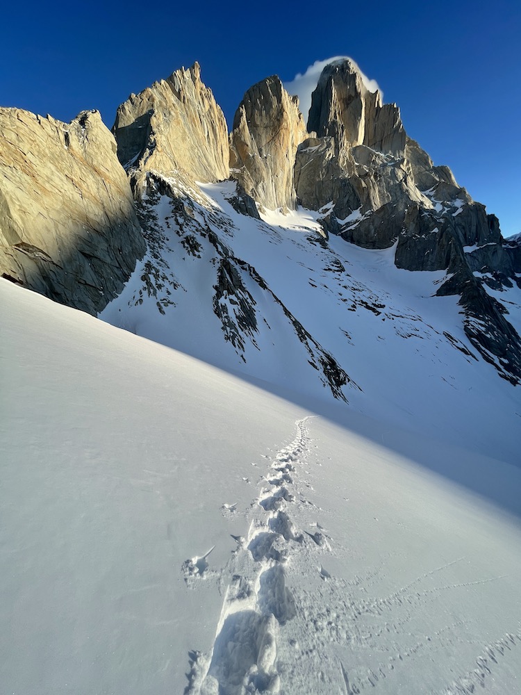 These past weeks there has been a lot of snowfall in the Chaltén Massif, which has been great for all the people going powder skiing up near Lago del Desierto, but not ideal for alpine climbing. On Sept. 7-8 it looked like I had a period of weather good enough to make an attempt, and I hiked into the mountains on Sept. 6. However, I had very deep trail breaking already to get up to Piedra Negra, and it only got deeper going up to Paso del Cuadrado and across the Glaciar Fitz Roy Norte. By the time I arrived in the cirque below the route it was 8pm, dark, and I knew I was way too late and way too tired to make an attempt the following day. I spent most of Sept. 7 lounging in my tent below the route, resting for a hoped-for attempt on the 8th. However, I got updated weather forecasts via Inreach from Rolo, and from Alisa, my girlfriend, that made it clear that the weather on the 8th would not be good enough. So, I left all my gear cached in the cirque below the route, and hiked out the evening of Sept. 7, arriving in town after midnight.