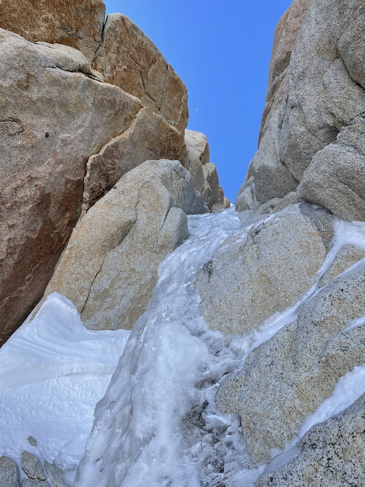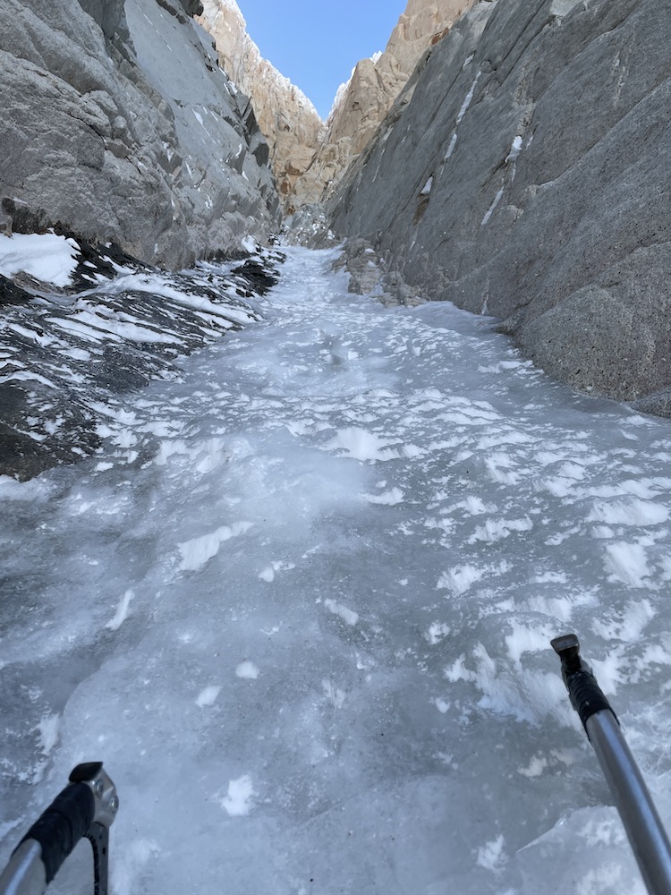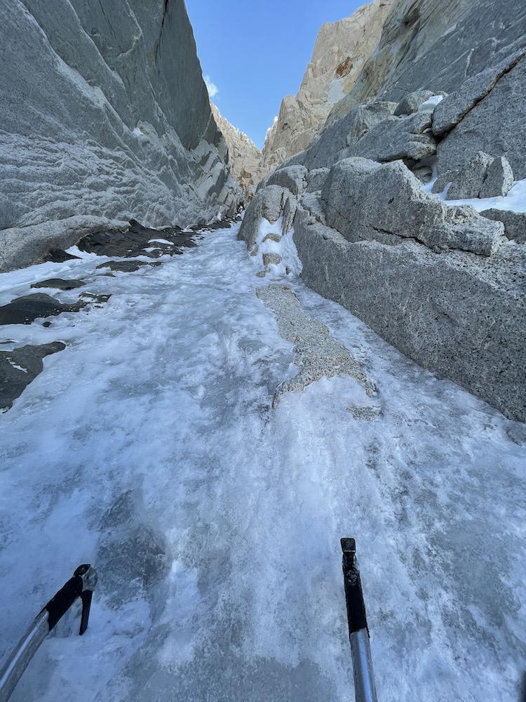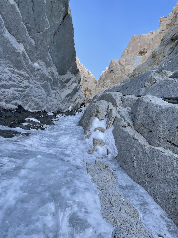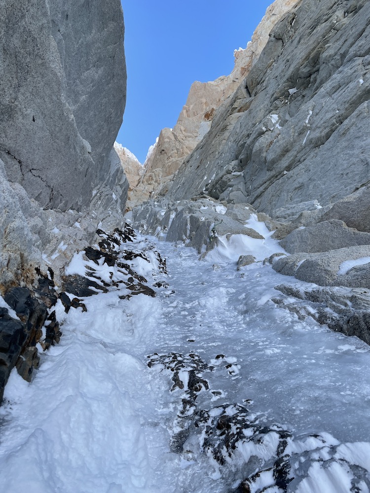 On Sept. 19 I again crossed the bergschrund at 7:00. The reason for not starting earlier is that the route is west-facing, and I knew that climbing in the sun would feel warmer, and allow me to wear thinner gloves, which always helps a lot on technical climbing. I had slightly refined my gear since my previous attempt, taking for instance one fewer pair of gloves, and one fewer cam. On the lower 1000m of couloir up to the Bloque Empotrado, conditions were about equivalent to before. In fact there was a bit more snow and névé sticking to the hard ice (which made for a bit less front-pointing and axe-swinging), but there was also more trail breaking on the first 300m, so roughly equivalent overall. It still took me 3:45 to reach the Bloque Empotrado, only 15 minutes faster than during my previous attempt.