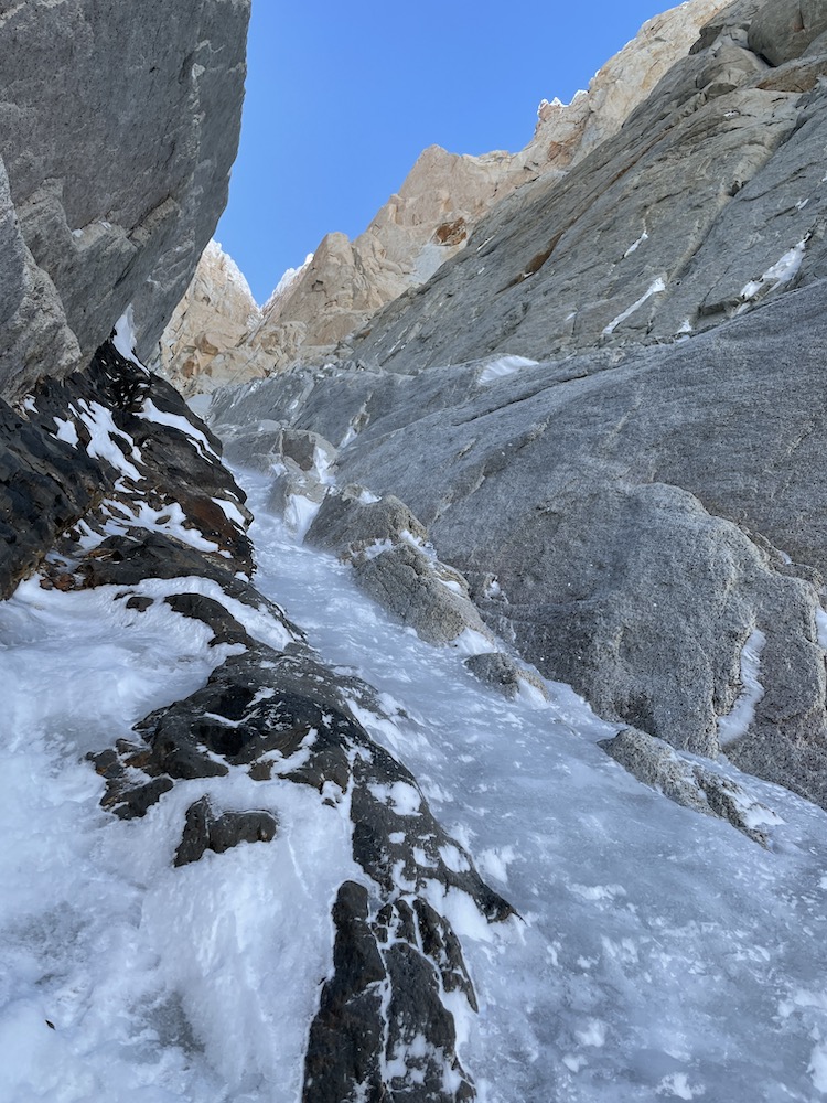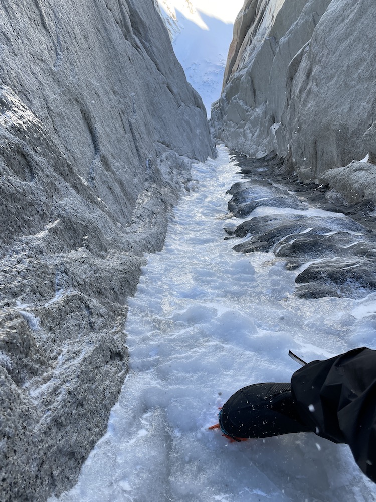 A handful of days later, it appeared that September 12 would have solid weather to make an attempt, and I hiked back in on September 11. My pack on the approach was relatively lightweight, and the deep snow on the glaciers had been largely blown away by strong winds, so this time I made it to the cirque below the route in the early afternoon, feeling fresh and feeling optimistic for the next day. On Sept. 12 I woke up at 4:30am, but it wasn’t until 7am that I crossed the bergschrund. In the very cold temperatures it took significant time in the morning to get suited up, heat up my 3 liters of water, and pack my water away in a manner to keep it well insulated. The first 300 meters of the couloir were easy snow climbing, and I was slowed down only by my heavy pack. I had 3 liters of water, a bunch of energy food, two 60m ropes, a single set of cams, a set of nuts, 10 pitons, 2 ice screws, a healthy selection of slings and carabiners, 4 pairs of gloves, 3 puffy jackets, and puff pants.