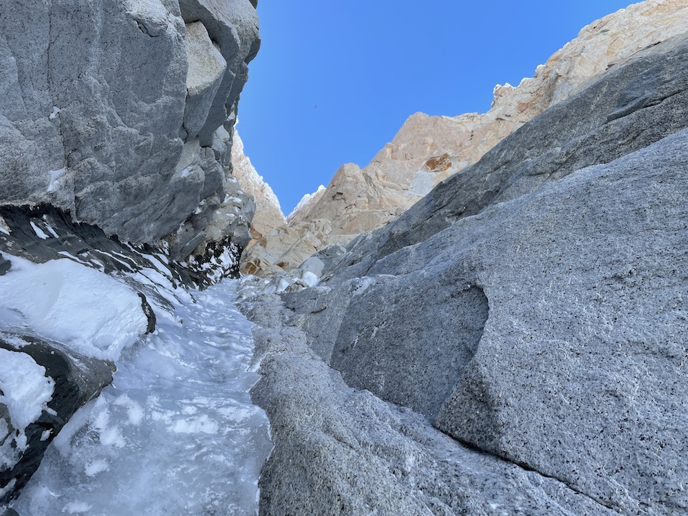 After the first 300 meters of snow climbing, the conditions changed to old, hard, grey ice for the remaining 700 meters of couloir up to the Bloque Empotrado. This was still climbing that I found technically easy, except for a couple sections where the ice was thin enough to require mixed climbing on the basalt dike. However, despite being technically easy, all the hard ice made the couloir drastically more tiring and time-consuming than in typical summer conditions, when it is filled with snow and névé. Although disappointing to have such difficult conditions in the couloir, it was not surprising. In any cold mountain range it is typical to have more snow on the mountain faces in spring, summer, and fall, and drier conditions on the faces in the winter, when the frigid air and strong winds scour the faces. Certainly in the Mont Blanc Massif it is normal to have “dry” conditions on north faces in the wintertime, with lots of hard, grey ice, but very little snow or névé. Regardless of the fact that I wasn’t surprised by the difficult conditions, it wasn’t until 4 hours after crossing the bergshrund, and a humongous amount of front-pointing and axe-swinging, that I arrived to the Bloque Empotrado, and the start of the more technical climbing.