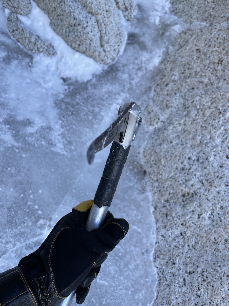 The first pitch above the Bloque Empotrado is a tricky one. I switched into thinner gloves to improve my climbing performance, but alternated between numb fingers and the screaming barfies while clearing snow off the handholds and slowly making my way up. I hauled my pack up behind me, and then continued up a pitch of easy mixed climbing to the base of some ice pitches. The ice pitches were more difficult than in summer, simply because the ice was cold, hard, and brittle. While accidentally hitting rock beneath thin ice I bent one of my picks pretty badly and thought that my attempt might be over for that reason. I spent some minutes hitting the pick with the hammer of my other axe, and bent it back close enough to straight to be able to at least continue. A couple pitches higher is a short step that is very easy in typical summer conditions, but in the very dry conditions was a major crux, with slabby, insecure, mixed climbing. I not only hauled my pack up behind me, but also used some rudimentary self-belay techniques to make it through this section in a manner that seemed adequately safe. Above this crux there was about 90 meters of easy mixed climbing in the gut of the gully before I traversed out to the right. A couple more tricky mixed bits brought me up to the point where one makes a short, diagonal rappel to the right to gain a hanging mixed gully system.