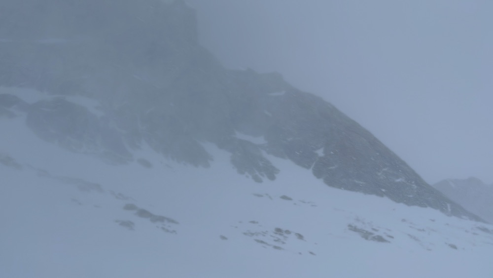 At 14:15 I reached my previous highpoint, only 15 minutes faster than during the earlier attempt. However, while I still felt quite intimidated, I felt significantly more confident than I had on my previous attempt. More importantly, the forecast indicated that the whole night would be calm, and I could afford the slow pace. Conditions on this section were also drier than before, with quite a bit of bare rock, and that was certainly helpful. I made the diagonal rappel, and from there made good time up to the upper southwest ridge (arriving at 15:45), encountering just a couple trickier sections in between.