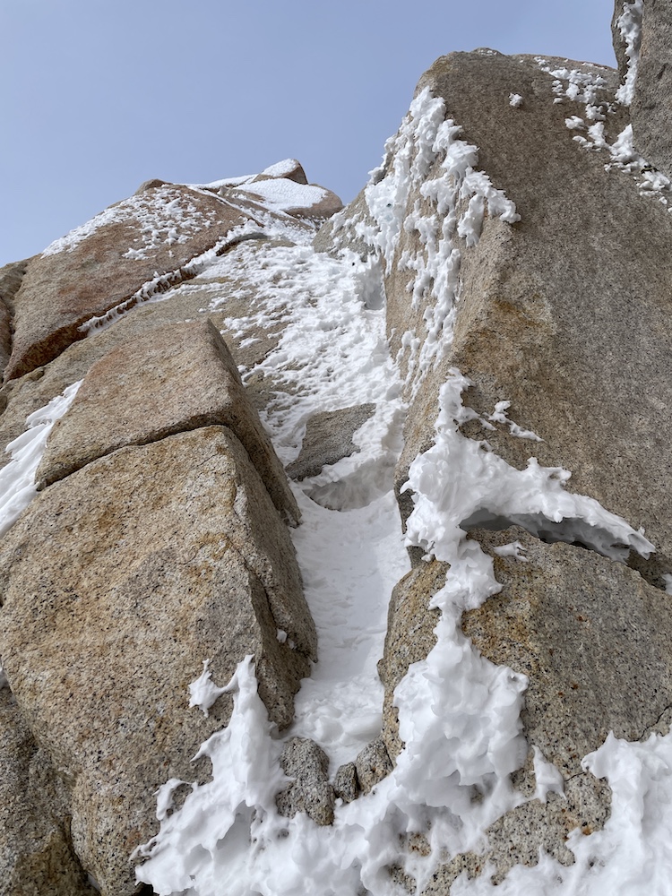 On the pitches above the Bloque Empotrado I made slightly better time than my previous attempt, largely because I knew better which way to go. It is at roughly this place where the route of ascent and the route of descent diverge. The route of ascent traverses out onto the right wall of the couloir, and climbs up the right wall to reach the southwest ridge above. The descent route follows the direct gut of the gully all the way down. At this point of divergence I had a new strategy compared to my previous attempt: I left one of my two 60m ropes here in the gully, and continued above with just one 60m rope. Descending the entirety of the Supercanaleta with a single 60m rope would be a nightmare. However, descending the upper rappels (perhaps 200m of descent) with a single 60m rope sounded reasonable, and it allowed me to climb with a lightweight backpack for the remainder of the climb. In hindsight I think this was an excellent strategy choice.