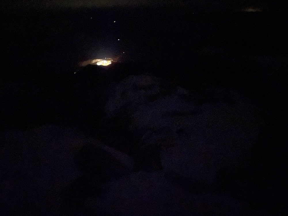 There are several tricky sections on the upper southwest ridge, and they all required great care. I was in a sort of focused frenzy for this whole section of the climb, moving as fast as I felt I safely could, but having to take a lot of care in many places, and a lot of time in several places. On some sections there was a bunch of rime plastered to the rock, which made progress slow, but in other places the rock was nearly bare, which was very advantageous. As the sun was dipping to the west it was filtered through low clouds above the South Patagonia Icecap, and made for utterly gorgeous scenery. I finished the last difficult pitch at 20:05, just as it was getting dark. I felt very relieved to be finished with the 5th-class climbing, but still very stressed and anxious. Being all alone on the summit slopes of Fitz Roy, in winter, in the dark, felt pretty absurd. From the top of the Supercanaleta, the upper slopes are largely south-facing (so they get no sun in winter time), and some bits were quite wind-sheltered, so there were sections of thigh-deep powder snow. This felt bizarre, because it is so atypical for the summit slopes of Fitz Roy, and I was also genuinely concerned about the potential for slab avalanches in a couple of spots. Aside from the sections of deep snow, there were several sections of hard, grey ice, with a thin layer of powder snow on top of it. This was easy enough to climb up, but it added stress knowing that I would need to downclimb hard ice on the descent. I reached the summit of Fitz Roy at 21:23, and could see the lights of El Chaltén 3000 meters below. I wondered if anyone down in town was outside taking in some fresh air, and might see my headlamp 3000 meters above. I had been extremely lucky all day to have nearly zero wind, but finally on the summit it was fairly breezy from the north. I felt extremely anxious about the descent, and started down just a couple minutes after arriving on the summit.
