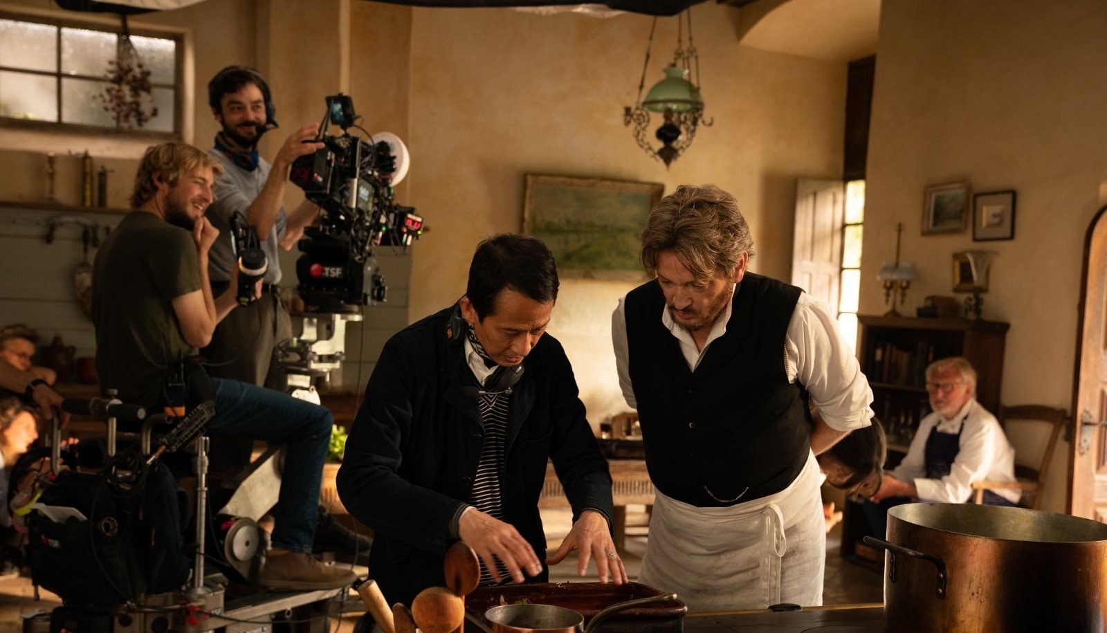 Đạo diễn Trần Anh Hùng (bên trái) trong quá trình làm phim Muôn vị nhân gian – Ảnh: hanoimoi.vn