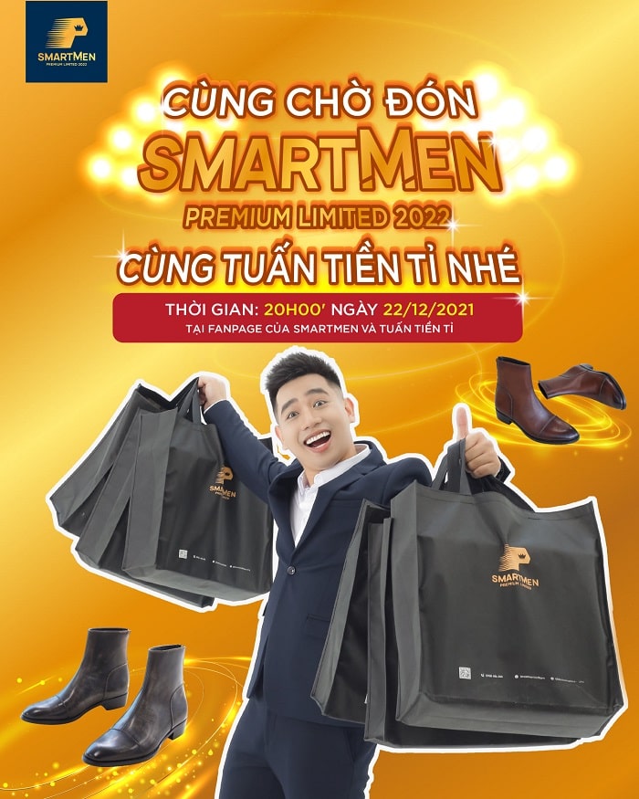 Vào 20h ngày 22/12/2021 Tuấn Tiền Tỉ sẽ cùng Smartmen tham gia Livestream mở bán dòng sản phẩm giới hạn PREMIUM LIMITED 2022 với giá cực ƯU ĐÃI. Vì đây là dòng sản phẩm giới hạn, nên mỗi năm Smartmen chỉ sản xuất 1 lần và giới hạn chỉ 30 đôi/1 mẫu sản phẩm. Do đó, hãy đặt ngay báo thức để theo dõi Livestream trên Fanpage của Smartmen để đón nhận những ưu đãi cực khủng nhé!