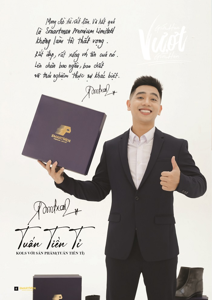 “Tôi vô cùng phấn khích khi trở thành gương mặt đại diện cho dòng sản phẩm giới hạn của SMARTMEN. Bởi đây là sản phẩm tôi đã rất mong chờ ở một thương hiệu giày da mà tôi gắn bó hơn 7 năm.” – Tuấn Tiền Tỉ chia sẻ.