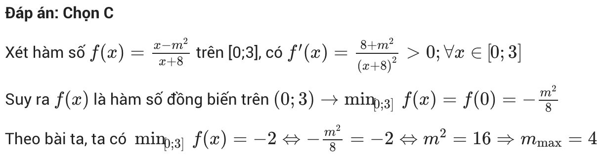 Đề bài: Cho hàm số với m là tham số thực. Tìm giá trị lớn nhất của m để hàm số đã cho có giá trị nhỏ nhất trên đoạn [0;3] bằng – 2.