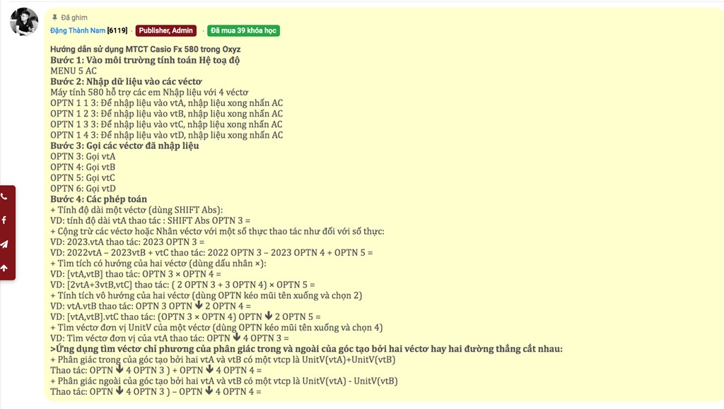 Hướng dẫn sử dụng MTCT Casio Fx 580 trong Oxyz