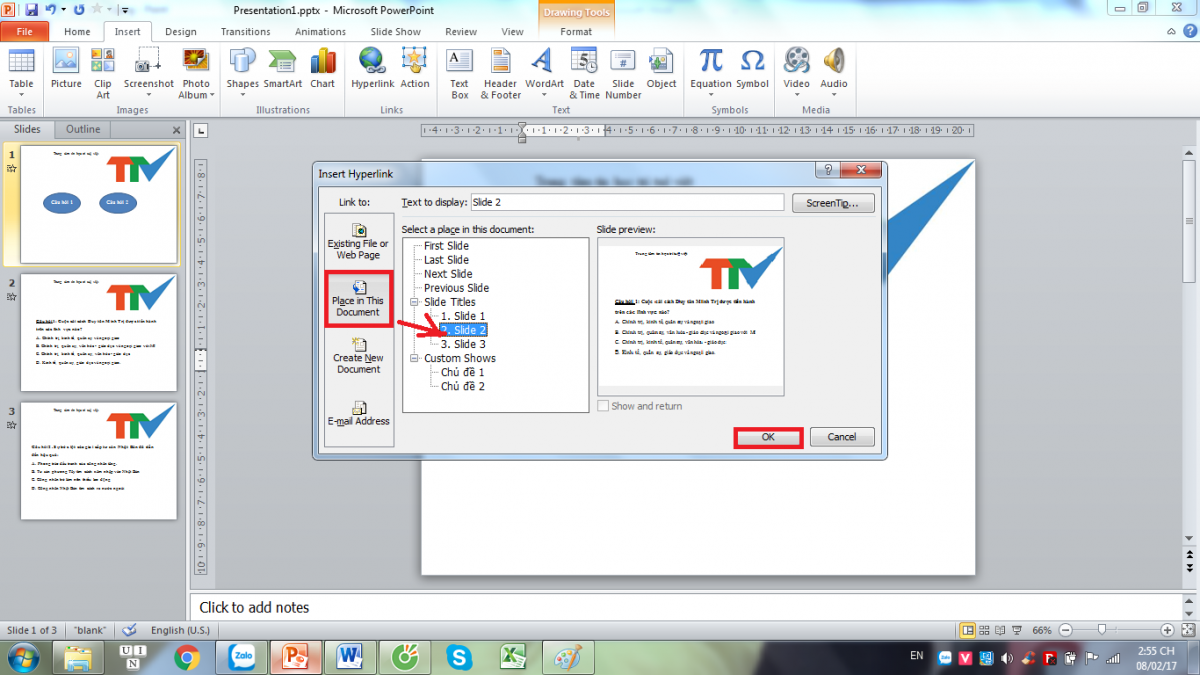 Sau “Hyperlink” bạn sẽ thấy hộp thoại “Insert Hyperlink” > “Place in this Document”. Tiếp theo chọn slide thứ 2 nhấp “Select a place in this Document” > “OK”. Bạn cứ làm tương tự như vậy cho hết 4 slide.