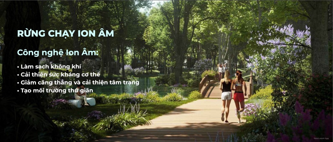 Tại công viên trung tâm, NSL bố trí quy hoạch đặt vị trí của rừng chạy ion âm gần nhất với sông nội khu, tạo ra môi trường rừng ẩm – là môi trường có mật độ ion âm cao nhất 100.000-500.000 (ion âm/cm3) và cách thiết kế các tầng cây tối đa quá trình quang hợp của thực vật, ưu tiên lựa chọn các loài cây có mức độ hình thành ion âm cao.