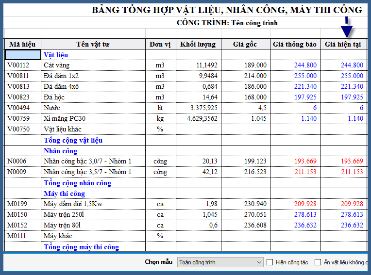 3. Khi đó tổng tiền Vật liệu, Nhân công, Máy thi công tính theo giá hiện tại được thể hiện ở Bảng Đơn giá chi tiết.