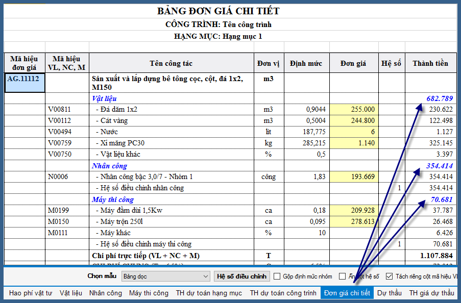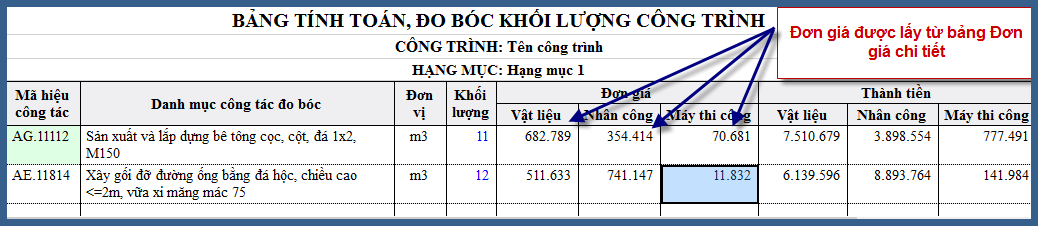 5. Kết quả là đơn giá Vật liệu, Nhân công, Máy thi công đã lấy theo bảng đơn giá chi tiết (so lại kết quả với mục 3).