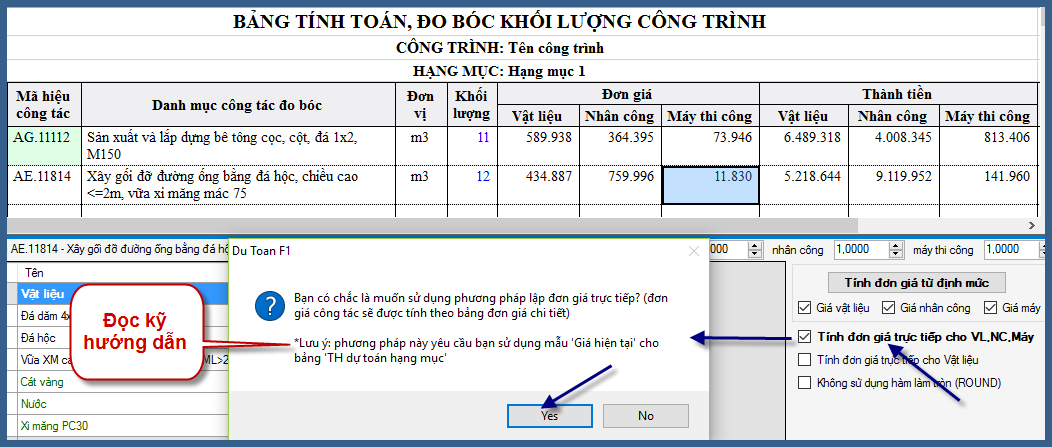 4. Lúc này sẽ tính đơn giá trực tiếp bằng cách quay lại bảng Công trình/tích chọn “Tính đơn giá trực tiếp cho VL, NC, Máy”/ một cửa sổ hiện ra kèm hướng dẫn: sử dụng mẫu “giá hiện tại” cho bảng “TH dự toán hạng mục”/ chọn Yes.