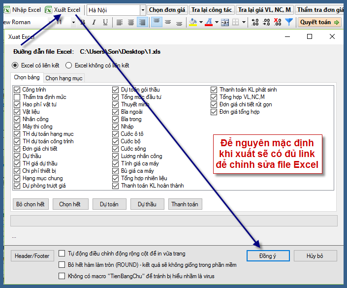 6. Kiểm tra bằng cách xuất Excel xem có giữ được liên kết không: để mặc định đã chọn “Excel có liên kết” và tất cả các bảng.