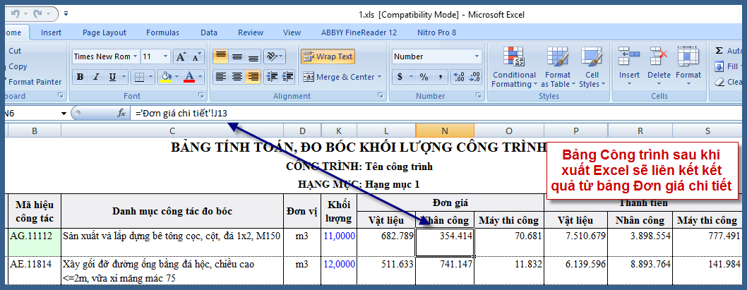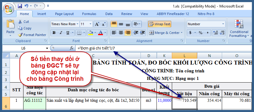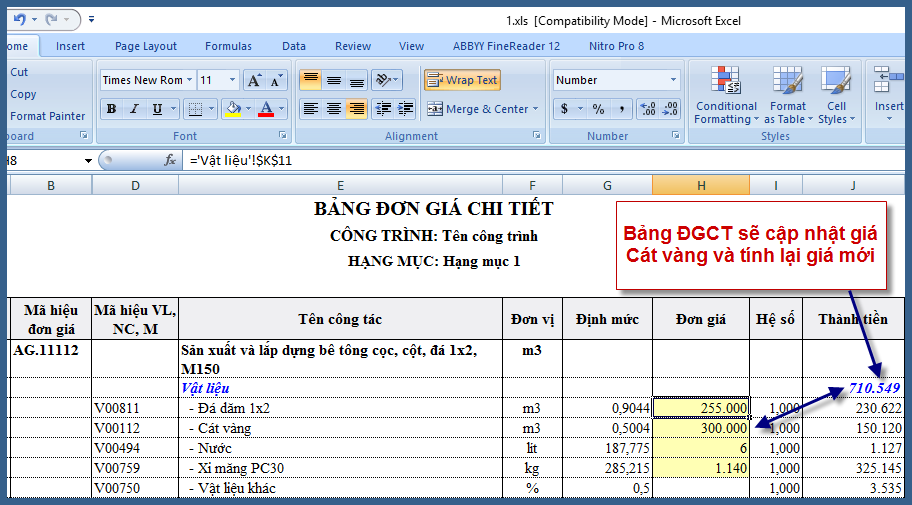10. Quay lại bảng “Công trình” để kiểm tra thì đơn giá vật liệu đã nhảy theo (so với kết quả mục 9).