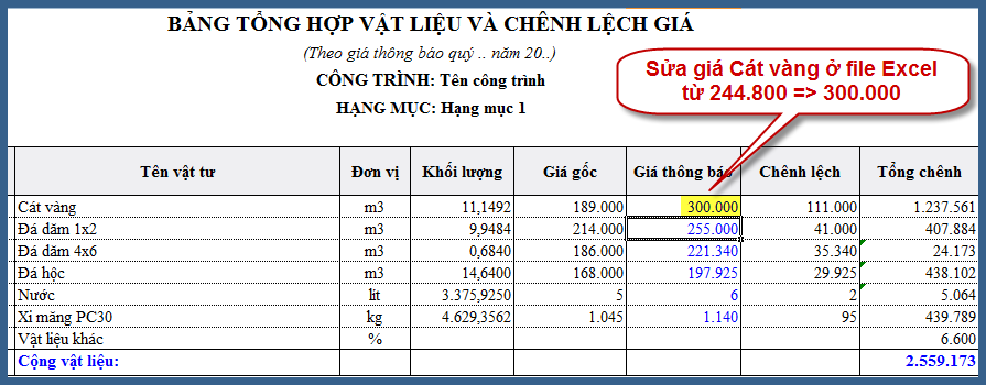 8. Kiểm lại liên kết trên file Excel bằng cách sửa giá Cát vàng (giá gốc ban đầu ở mục 3).