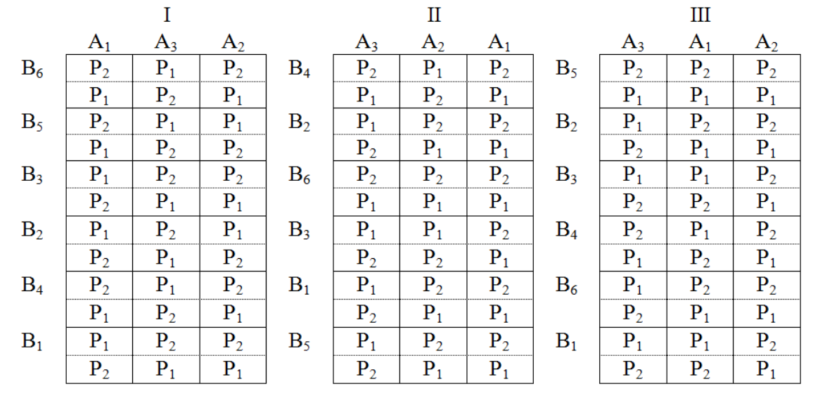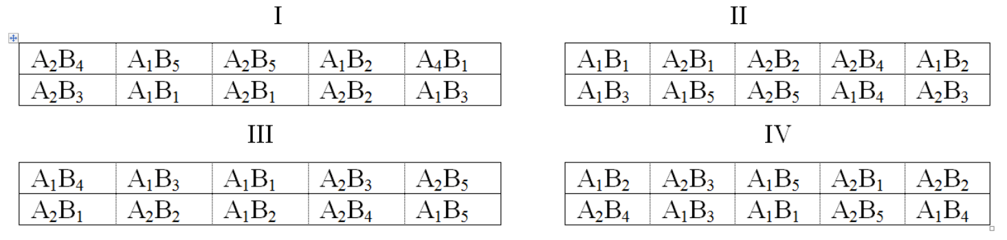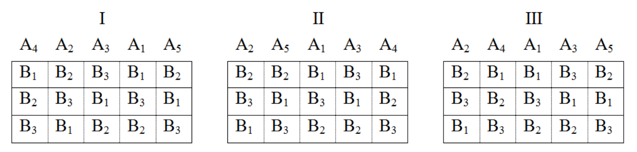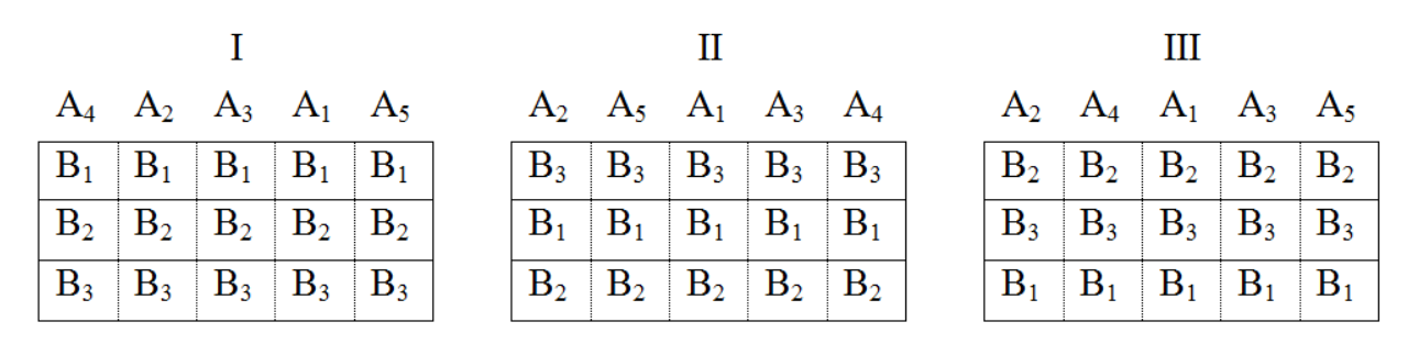 Trong kiểu bố trí này, thứ tự các ô phụ (B1-B3) trong lô chính (A1-A5) thay đổi nên loại trừ được khác biệt giữa các lô chính.