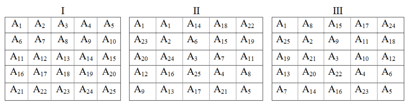 (25 yếu tố A-Giống, t=25, k=3, λ=1)