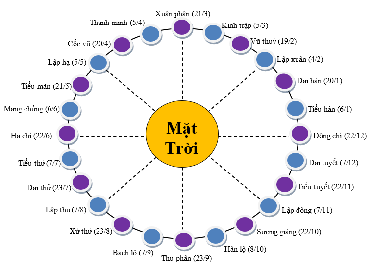 Trái Đất chuyển động quanh Mặt Trời đồng thời với sự vận động tự quay quanh trục Trái Đất, trục này nghiêng với mặt phẳng Hoàng đạo theo hướng không đổi một góc 66033’. Do vậy, mặt phẳng Hoàng đạo nghiêng với mặt phẳng Xích đạo của Trái Đất 23027’. Trong một năm, tia sáng Mặt Trời chỉ chiếu thẳng góc lần lượt xuống các vĩ tuyến từ 23027’N đến 23027’B rồi trở về 23027’N. Trên quỹ đạo chuyển động của Trái Đất quanh Mặt Trời, có 4 điểm đặc biệt vào các ngày: 21 hoặc 22/12, Mặt Trời chiếu thẳng góc xuống chí tuyến Nam (23027’N); 21 hoặc 20/3, Mặt Trời chiếu thẳng góc xuống xích đạo; 22 hoặc 23/6, Mặt Trời chiếu thẳng góc xuống chí tuyến Bắc (23027’B); 23 hoặc 22/9, Mặt Trời chiếu thẳng góc xuống xích đạo. Các nhà thiên văn học Trung Quốc gọi các điểm đó lần lượt là Đông chí (giữa mùa đông), Xuân phân (giữa mùa xuân), Hạ chí (giữa mùa hạ), Thu phân (giữa mùa thu). Từ các điểm đặc biệt đó, người ta chia quỹ đạo chuyển động của Trái Đất quanh Mặt Trời thành 12 cung đều nhau tương ứng với 12 cung trên Hoàng đạo, đặt tên theo các điểm đặc biệt và kiểu thời tiết đặc trưng của vùng cận nhiệt đới gió mùa ở Trung Quốc. Điểm bắt đầu của 1 cung (tiếp giáp giữa 2 cung) gọi là “trung khí”, điểm giữa cung gọi là “tiết khí”.
