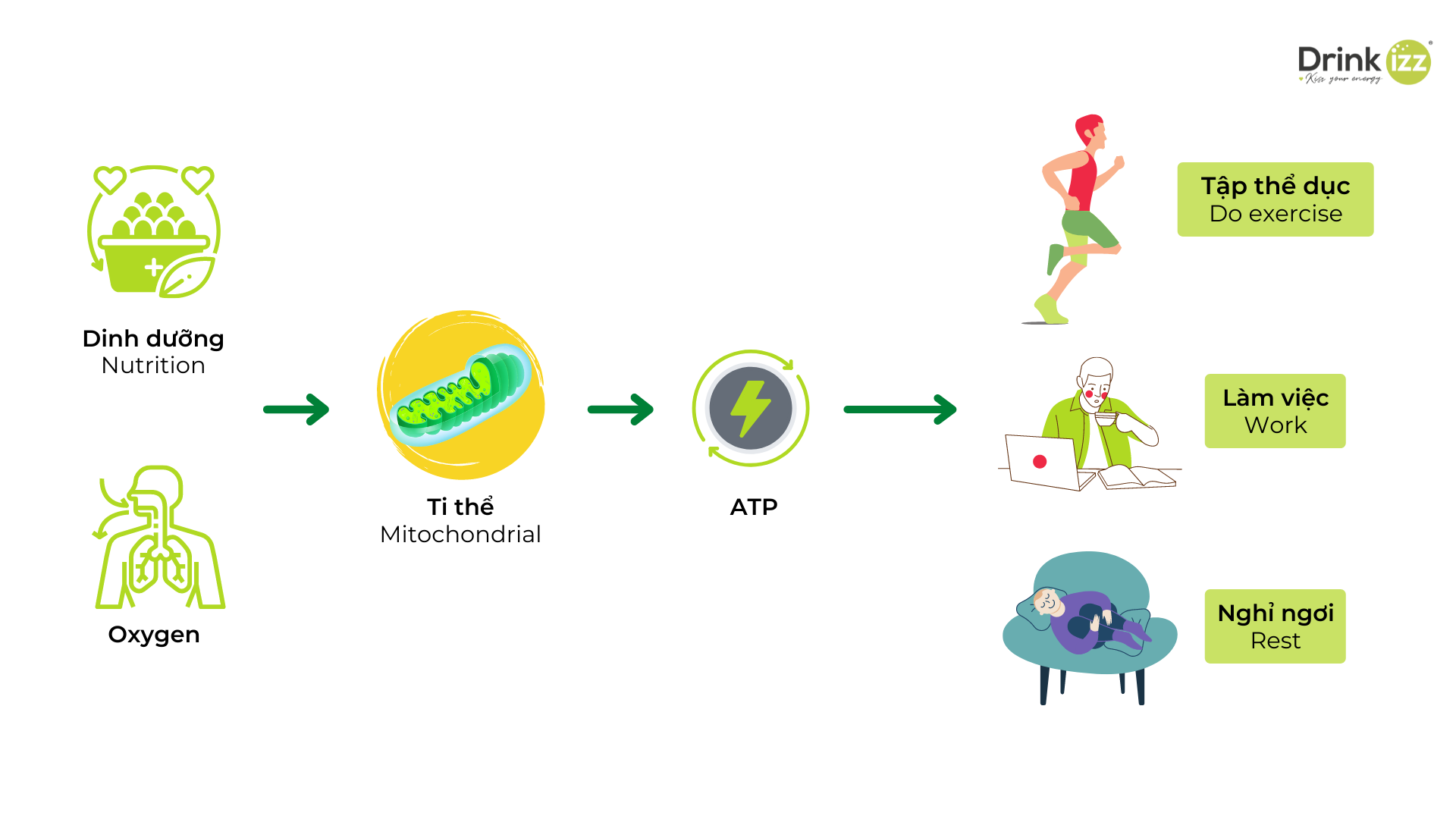 Đây là quá trình sử dụng oxy từ hít thở và năng lượng hóa học có trong chất dinh dưỡng tạo thành adenosine triphosphate (ATP). ATP là năng lượng được sử dụng cho các hoạt động sống của tế bào và cơ thể.