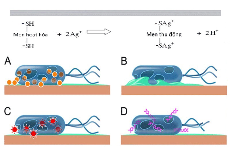 Ion bạc (Ag+) có hiệu lực rất mạnh khi tấn công vào các vị trí tế bào của vi khuẩn, nhất là các nhóm chức mang điện tích âm trong cấu tạo sinh học phân tử của tế bào vi khuẩn như -SH, -COOH,…