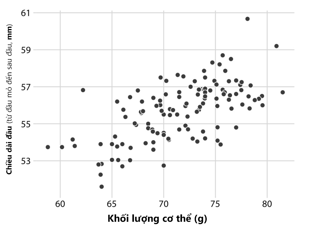 Hình 2. Biểu đồ phân tán về mối tương quan giữa chiều dài đầu và khối lượng cơ thể của 123 con chim blue jay (Nguồn: Fundamentals of Data Visualization (Wike, 2019))