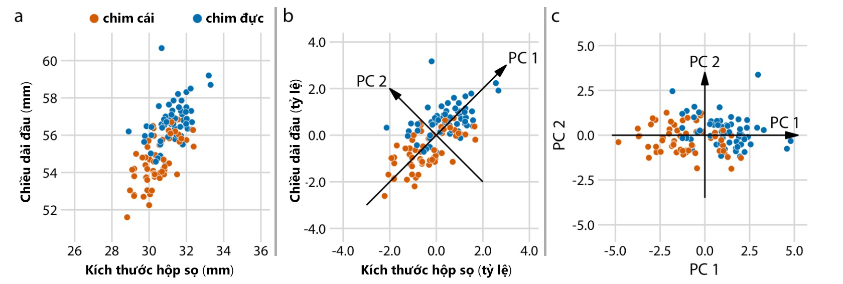 Trong Hình 11 là ví dụ đơn giản khi sử dụng phương pháp PCA để biến đổi cho tập dữ liệu 2 chiều. Hình 11a là dữ liệu gốc ban đầu về mối quan hệ giữa chiều dài đầu và kích thước hộp sọ của 123 con chim blue jay, phân loại chim đực và cái theo màu sắc. Hình 11b là bước chia tỷ lệ các giá trị dữ liệu ban đầu thành giá trị trung bình = 0 và phương sai đơn vị. Tiếp đến là xác định các biến mới (các thành phần chính) dọc theo hướng của sự thay đổi tối đa trong dữ liệu. Hình 11c là bước cuối cùng, chiếu dữ liệu vào các tọa độ mới, phép chiếu này tương đương với phép quay của các điểm dữ liệu xung quanh điểm gốc, cụ thể ở đây là xoay 45 độ.
