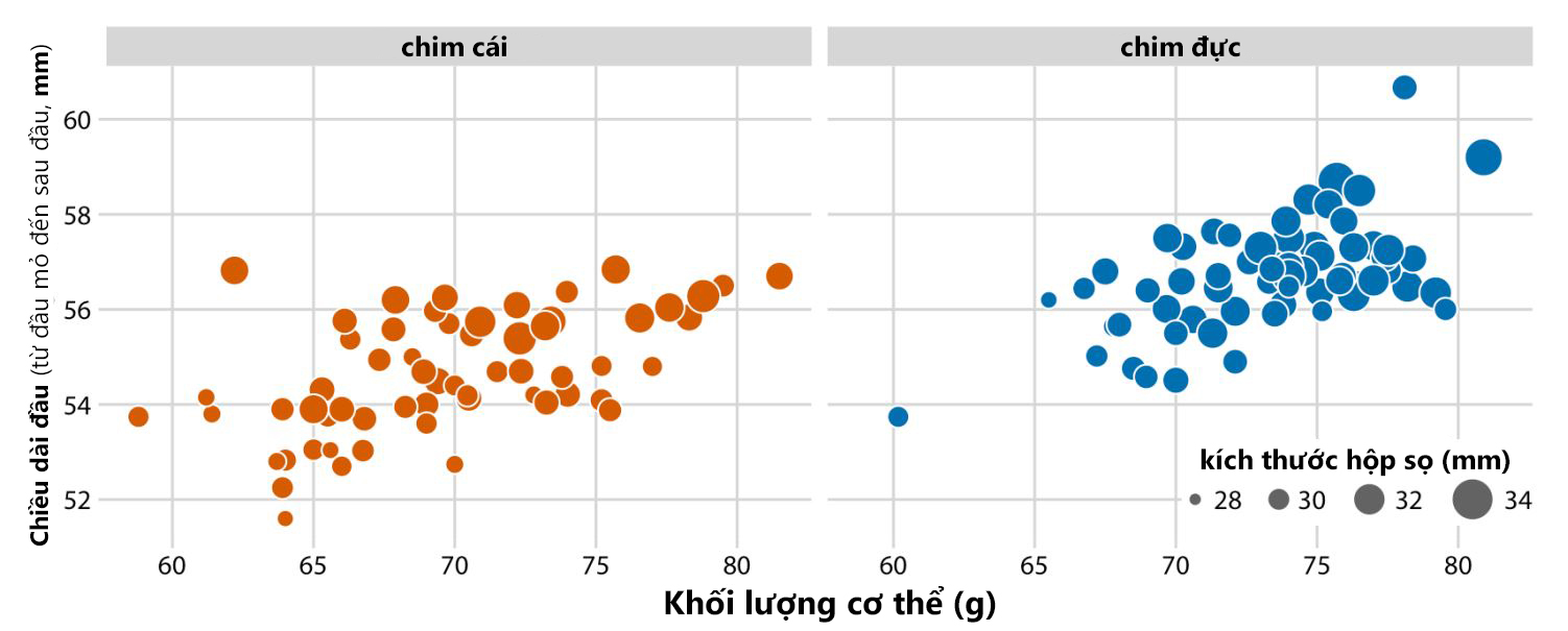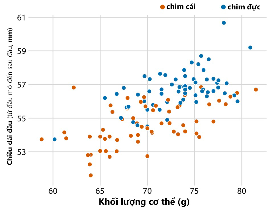 Ta có thể sử dụng thêm biến phân loại để phân tích sự khác biệt giữa chim đực và cái (Hình 3). Có thể thấy trong biểu đồ, ở cùng một khối lượng cơ thể, con mái có xu hướng có đầu ngắn hơn con đực, đồng thời trọng lượng của chim cái cũng nhẹ hơn chim đực.
