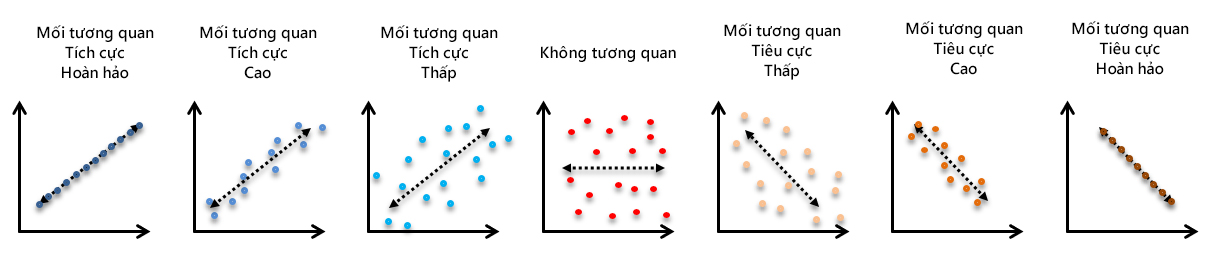 Biểu đồ phân tán có thể gợi ý nhiều loại tương quan giữa các biến với một khoảng tin cậy nhất định. Các mối tương quan có thể là tích cực, tiêu cực, hoặc không có bất kỳ tương quan nào (Hình 4). Để đo lường độ mạnh liên kết giữa hai biến định lượng liên tục, hệ số tương quan Pearson là thang đo thường được sử dụng (Chi tiết về hệ số tương quan Pearson tham khảo trong bài viết “Thống kê mô tả trong nghiên cứu – Các đại lượng về sự tương quan”)