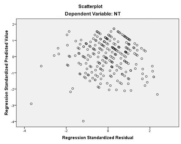 Trong mô hình hồi quy tuyến tính, biểu đồ phân tán được sử dụng để kiểm định mối liên hệ tuyến tính giữa biến phụ thuộc với các biến độc lập. Giả định này sẽ được kiểm tra bằng biểu đồ phân tán giữa các phần dư chuẩn hóa trên trục tung và giá trị dự đoán chuẩn hóa trên trục hoành. Nếu kết quả cho thấy các giá trị phần dư được rải ngẫu nhiên xung quanh tung độ 0 và hình dạng tạo thành một đường thẳng thì giả định liên hệ tuyến tính không bị vi phạm Hình 5).