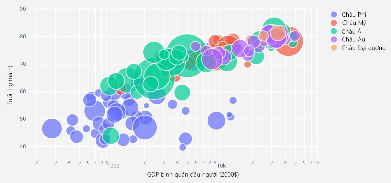 Trong biểu đồ trên, ta chỉ có thể hình dung được những thông tin chung nhất về mối tương quan giữa tuổi thọ và GDP bình quân đầu người theo các châu lục và sự chênh lệch về dân số thông qua các bong bóng. Tuy nhiên, không rõ cụ thể bong bóng nào là của quốc gia nào và mối tương quan giữa tuổi thọ, GDP bình quân đầu người với dân số của các quốc gia đó.