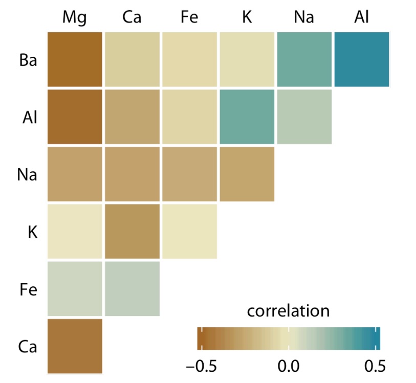 Hình 9. Mối tương quan về hàm lượng khoáng chất được biểu diễn bằng các ô vuông theo dải màu tương ứng với hệ số tương quan (Nguồn: Fundamentals of Data Visualization (Wike, 2019))