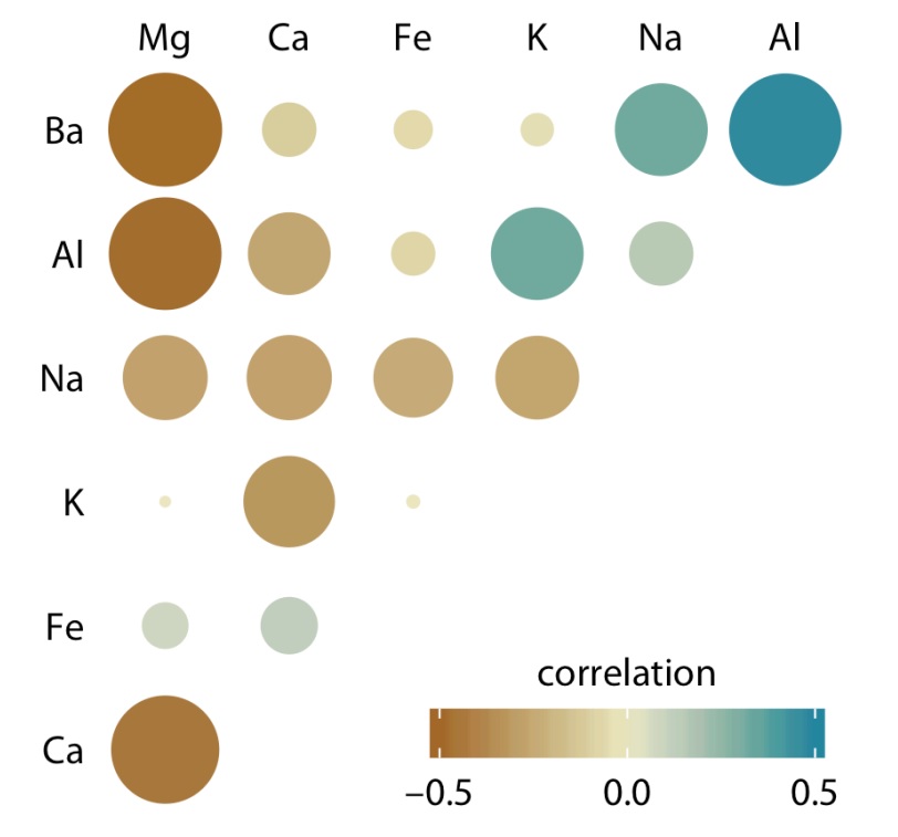Hình 10. Mối tương quan về hàm lượng khoáng chất được biểu diễn bằng các ô tròn theo dải màu và kích thước tương ứng với hệ số tương quan (Nguồn: Fundamentals of Data Visualization (Wike, 2019))