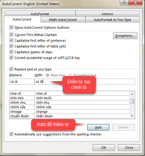Word có 1 tính năng là AutoCorrect, mỗi khi bạn đánh sai, Word sẽ tự động chỉnh lại từ đúng, nhưng để làm được điều này bạn phải dạy Word “học” từ nào là sai và từ nào là đúng.