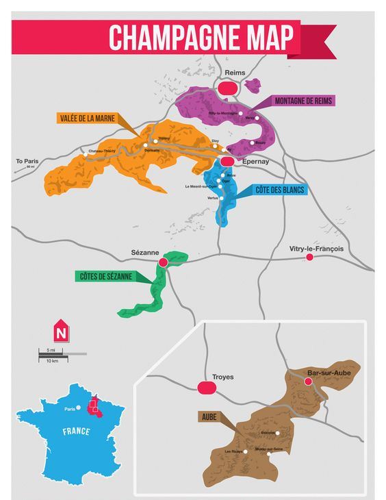 Within the Champagne region, there are actually five main sub-regions which are responsible for bringing both diversity and consistency to champagne. Champagne is a blended wine and each sub-region or district is renowned for producing a specific type of grape and often a unique character to that grape variety influenced by the specific location, soil, sub-climate or vineyard aspect (terroir).