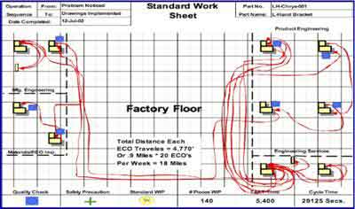 Spaghetti Diagram: Biểu đồ Spaghetti được áp dụng để phân tích tất cả các di chuyển và quãng đường mà sản phẩm, nhân viên phải di chuyển trong quy trình sản xuất, qua đó việc thiết kế quy trình sản xuất, sắp xếp máy móc thiết bị cũng như khu vực làm việc sao cho việc di chuyển là ít nhất trong kho.